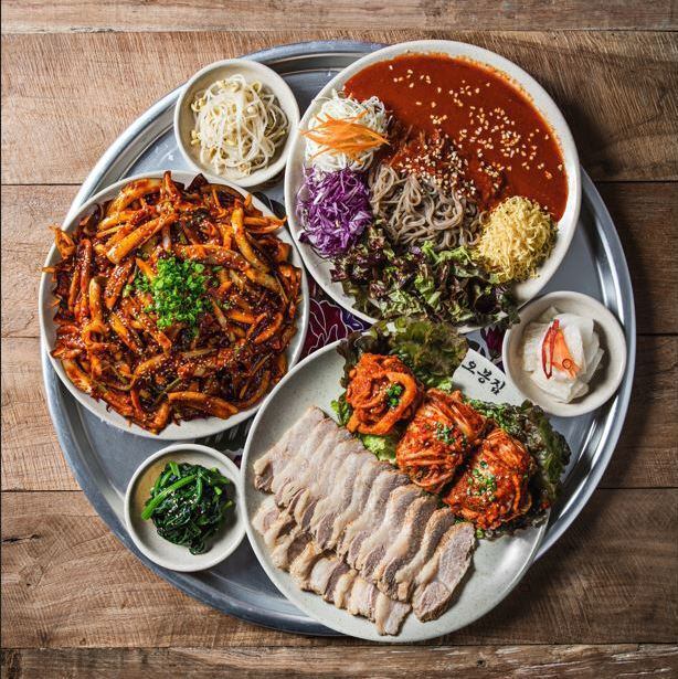 在原來的韓國店裡,大多數顧客都會點“五奉特餐”,這是一套烤大章魚、菜心和粗麵(辣味蕎麥麵)。這道菜適合 2-3 人食用,在嫩豬肉上放上泡菜和大章魚,美味可口,令人回味無窮!